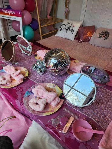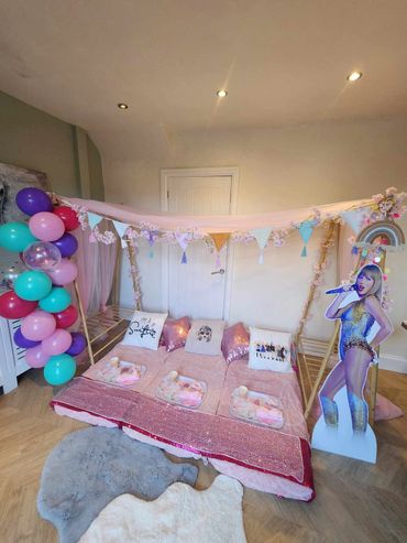 Our indoor canopy sleepover have lots of different themes available, some of our most popular are: Plouise, Taylor Swift, Gaming, K-Pop Demon Hunters, Lilo & Stitch, Barbie and many more!